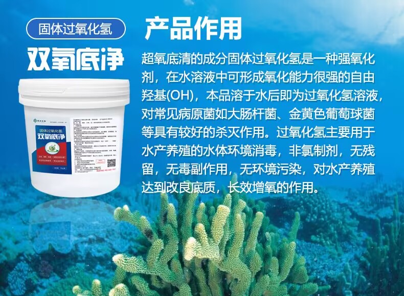 “双氧底净”:固体过氧化氢,非氯制剂,无残留,无毒副作用,无环境污染,水产养殖达到改良底质,长效增氧的作用。